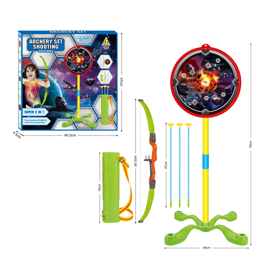 Súper juego de tiro con arco, El arco mide 74 cm de largo, lo que lo convierte en el tamaño perfecto para que los niños lo manejen cómodamente. Las flechas miden 56 cm de largo y cuentan con ventosas que se pueden fijar fácilmente a objetivos u otras superficies lisas. El objetivo en sí mide 90 cm de alto y 30,5 cm de diámetro, lo que proporciona a los niños un objetivo desafiante pero alcanzable al que apuntar.