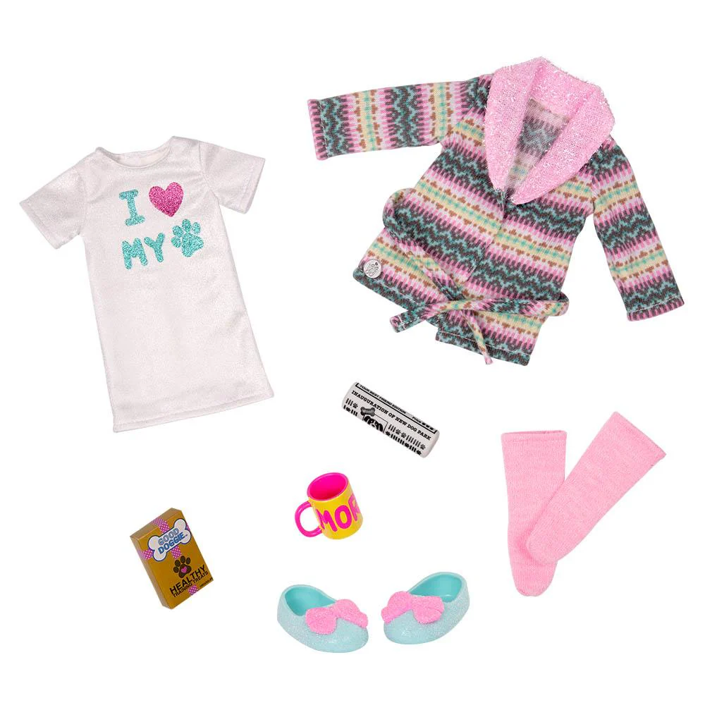 ¡Comienza tu mañana de manera brillante con el atuendo! Incluye bata de muñeca, vestido tipo suéter con estampado brillante, calcetines rosas hasta la rodilla, zapatos con brillos, rollo de periódico de juguete para perros, taza y caja de golosinas para mascotas. *La muñeca y mascota se vende por separado.