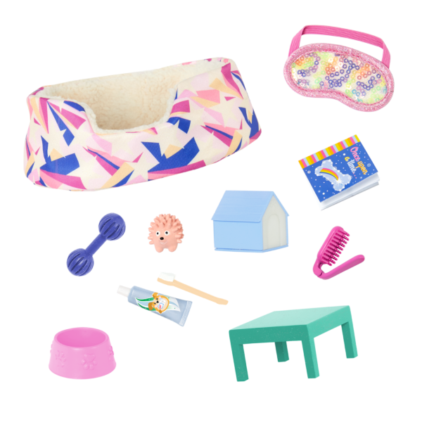 ¡Crea el lugar perfecto para dormir para tus mascotas juguetonas con el set de dormir! Prepara a tu cachorro para ir a la cama cepillándole los dientes con el cepillo de dientes y mantén su pelaje suave con el cepillo plegable. ¡Luego métalos dentro de la cómoda cama mientras les lee una historia de buenas noches del libro! Decora tu espacio con la linda mesita de noche y enciende la casa para perros iluminada para mantenerlos más seguros durante la noche. ¡Y cuando se despierten, es hora de un día de juegos de cachorros con el juguete para masticar erizo y la mancuerna de ejercicio! *Las muñecas y mascotas se venden por separado.