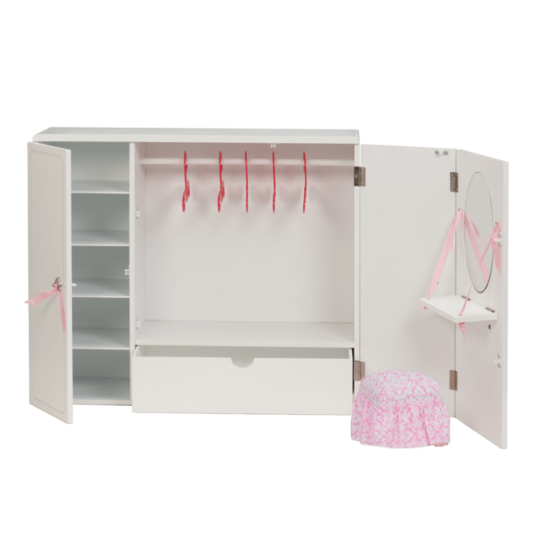 Este clóset de madera completamente ensamblado contiene 5 estantes interiores perfectos para guardar zapatos, carteras, ropa y sombreros. Adicionalmente, incluye 5 ganchos de ropa para colgar vestidos y camisas. El cajón extraíble tiene un tamaño ideal para guardar accesorios tales como botas y mochilas. Utiliza el taburete para ayudar a tus muñecas a pararse frente al espejo y bandeja plegable. *La muñeca se vende por separado.