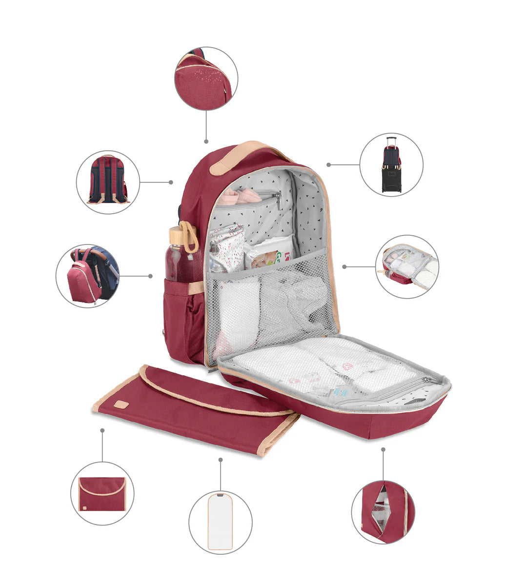 Multi-pockets: it has several inside pockets including one zipped pocket for the parent's belongings. On the outside, a stretchy pocket and a large insulated pocket accessible via the front of the bag