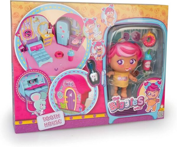 La única Biggie con Playset: La Casa del Diente. En la casita hay una nevera para guardar la comida de la Biggie, una mesa, un baño para cepillar sus dientes, y una cama que se dobla y que tiene una sorpresa: Pon el diente de la Biggie en la almohada y descubre el regalo de Ratoncito Pérez.