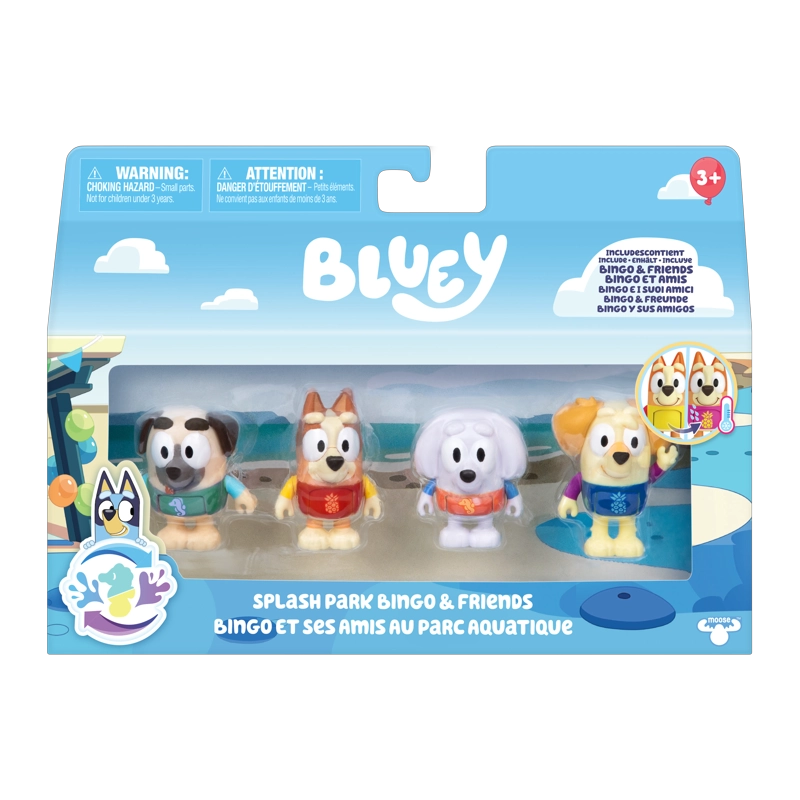 No hay mejor diversión bajo el sol que un día chapoteando con el Pack de 4 de Bingo y sus Amigos de Splash Park. Bingo, Jasper, Chucky y Lila ya tienen sus rozaduras y están listos para jugar en el agua. Cambian de color, a los niños les encantará ver cómo los colores cambian ante sus ojos al sumergirlos en agua tibia o fría.