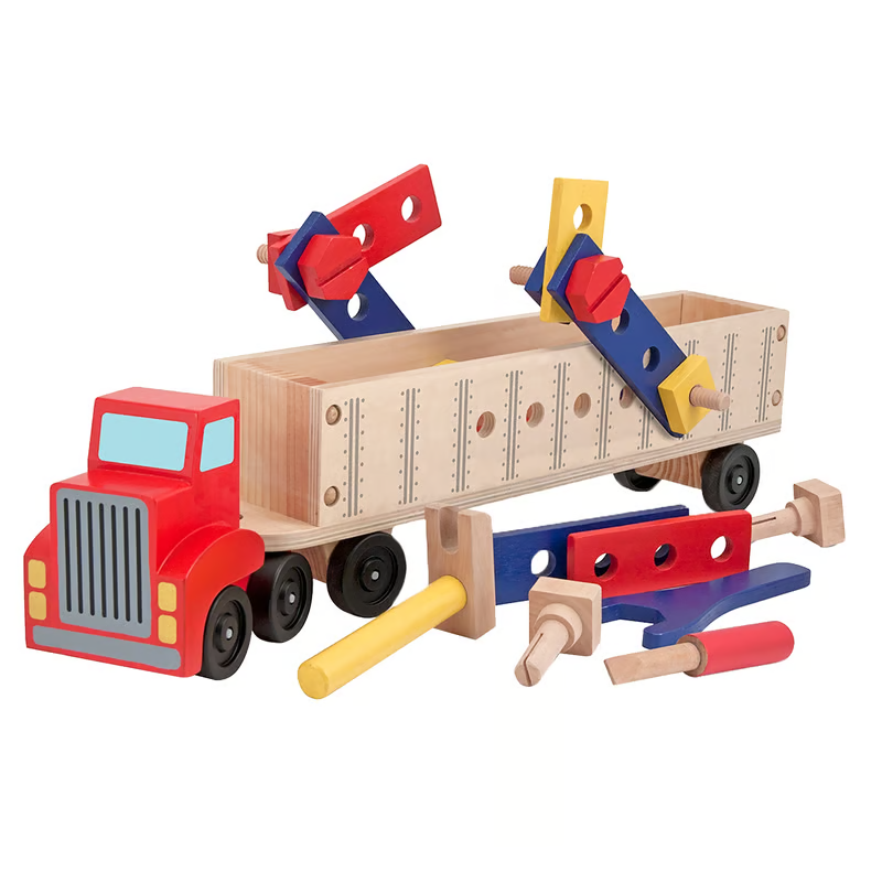 Este resistente remolque está listo para partir. Cargado con piezas de construcción de madera y perforado con agujeros para clavos y pernos, el camión es un verdadero sitio de construcción móvil. Incluye 22 piezas de madera, las cuales se guardan de forma práctica dentro del camión. Este juguete es una gran herramienta para practicar la coordinación, la motricidad fina y la destreza manual.