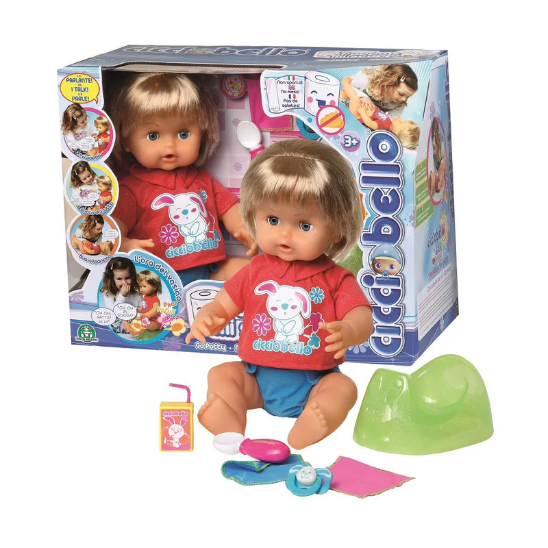 Disfruta jugando con Cicciobello, un muñeco bebé que te permitirá vivir la experiencia de ser una mami de verdad. Cicciobello recrea situaciones y gestos típicos del cuidado de un bebé, como sus primeras comidas, el malestar en su barriguita y aprender a ir al baño. Te pedirá comida o bebida y, después de la hora de comer, ¡es momento de hacer popó! Dale un suave masajito en la pancita y escucha sus divertidos sonidos, luego siéntalo en su bacenilla para descubrir qué sucede.