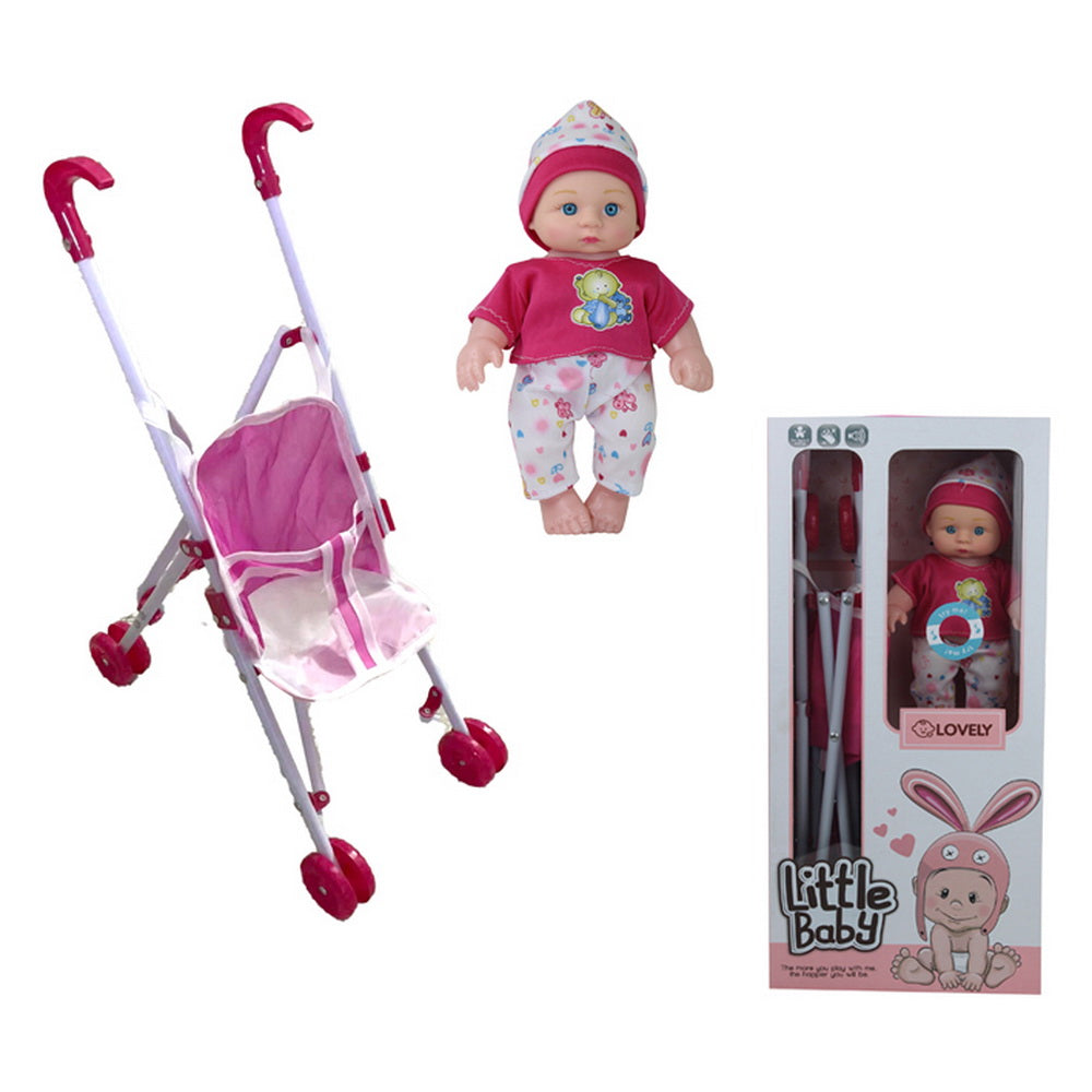 Cochecito de bebŽ plegable con accesorios y mu–eca. El cochecito cuenta con cintur—n de seguridad para que la mu–eca no se caiga, tela suave lavable, asas f‡ciles de agarrar especiales para manos peque–as. La mu–eca tiene un cuerpo suave que es perfecto para abraza. medidas 22x8,5x46 cm.