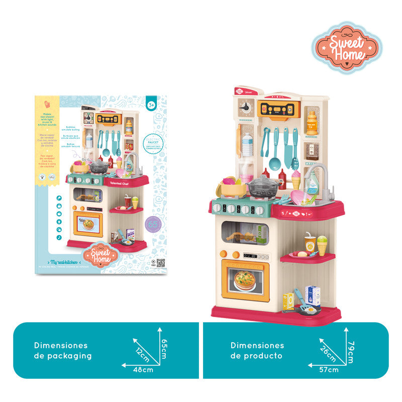 Cocina a vapor de juguete con vapor real, ebullición simulada, grifo eléctrico, luz, sonido, música y 65 accesorios.