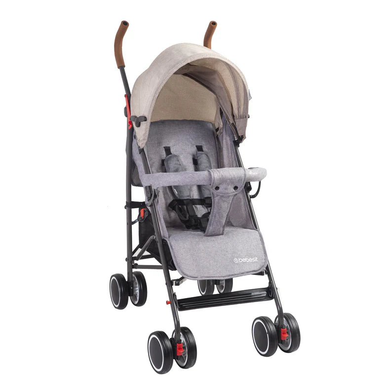 Coche Paragua Clap Melange Beige Características: Toldo completo Asiento con 3 posiciones de reclinado 4 Ruedas delanteras giratorias en 360º 4 Ruedas traseras de alta densidad con freno centralizado Sistema de cierre ultra compacto Incluye manilla para su fácil transporte Protector delantero acolchado desmontable cinturon de 5 puntas Material de Estructura de tubo metalico de aleacion Plegable Ruedas de plástico de alto tráfico Apoyapies Peso máximo de usuario 15 kg Edad máximo de usuario 3 años uso apto para niños de 6 a 36 meses.( no usar en menores de 6 meses) Peso de producto 5 kg Dimensiones: Alto: 107 cm Ancho: 47 cm Profundidad: 76 cm