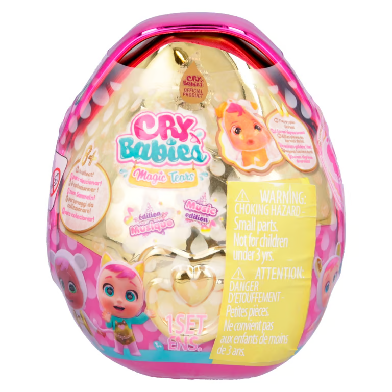 Conoce la nueva Edición Musical de Bebés Llorones Lágrimas Mágicas. Ellos son la banda “The Tears”, ¡la mejor banda de música de todas! Hay más de 8 personajes para coleccionar, cada uno de ellos toca un instrumento diferente y viste un atuendo musical personalizado. ¡Alimenta a la muñeca con la botella mágica, aprieta su barriga y llorará lágrimas doradas! La cápsula tiene efecto de color galvanoplastia e incluye 9 sorpresas: un biberón, un chupete, una silla, una prenda personalizada, un par de zapatos, un instrumento personalizado, un accesorio único y una hoja de pegatinas.