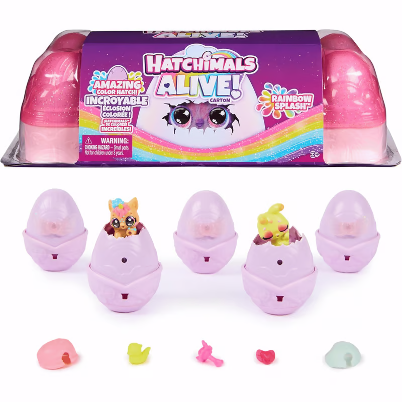 ¡Crea una caja de personajes con la caja Hatchimals Alive Rainbow Splash! Con tu amor y cuidado, estos divertidos Hatchimals cobran vida de una manera nueva y colorida: huevos que eclosionan en el agua, ¡cambiando el color del agua para que coincida con el personaje que está adentro! Abre la tapa brillante para descubrir una zona de eclosión incorporada y 5 huevos Hatchimals que contienen 5 personajes, cada uno inspirado en los colores del atardecer. Para comenzar a eclosionar, coloca un huevo en la zona de eclosión y quita las alas, luego llena el área con agua. ¡En segundos, el agua cambia de color a medida que tu nuevo amigo comienza a revelarse, rompiendo el huevo! Una vez que se hayan revelado los 5 personajes súper lindos, coloca sus alas y usa los 5 accesorios nutritivos (manta para envolver, patito de goma, sonajero y más) para agregar a tu narrativa imaginativa. ¡Seca la caja y exhibe los personajes adentro o llévate la caja contigo!