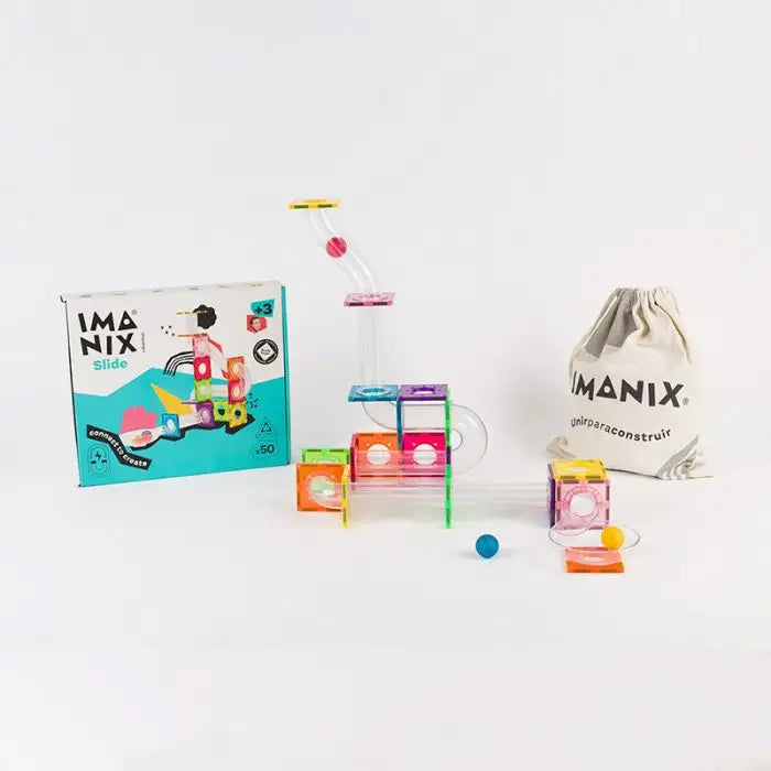 Imanix Slide 50 pieces, 1 square, 3 balls, 8 tubes, 2 u shaped tubes, 1 rotating slide, 21 windows tubes, 4 short tubes, 8 half u shaped tubes, 2 sloping tubes, 1 booklet and 1 carry bag