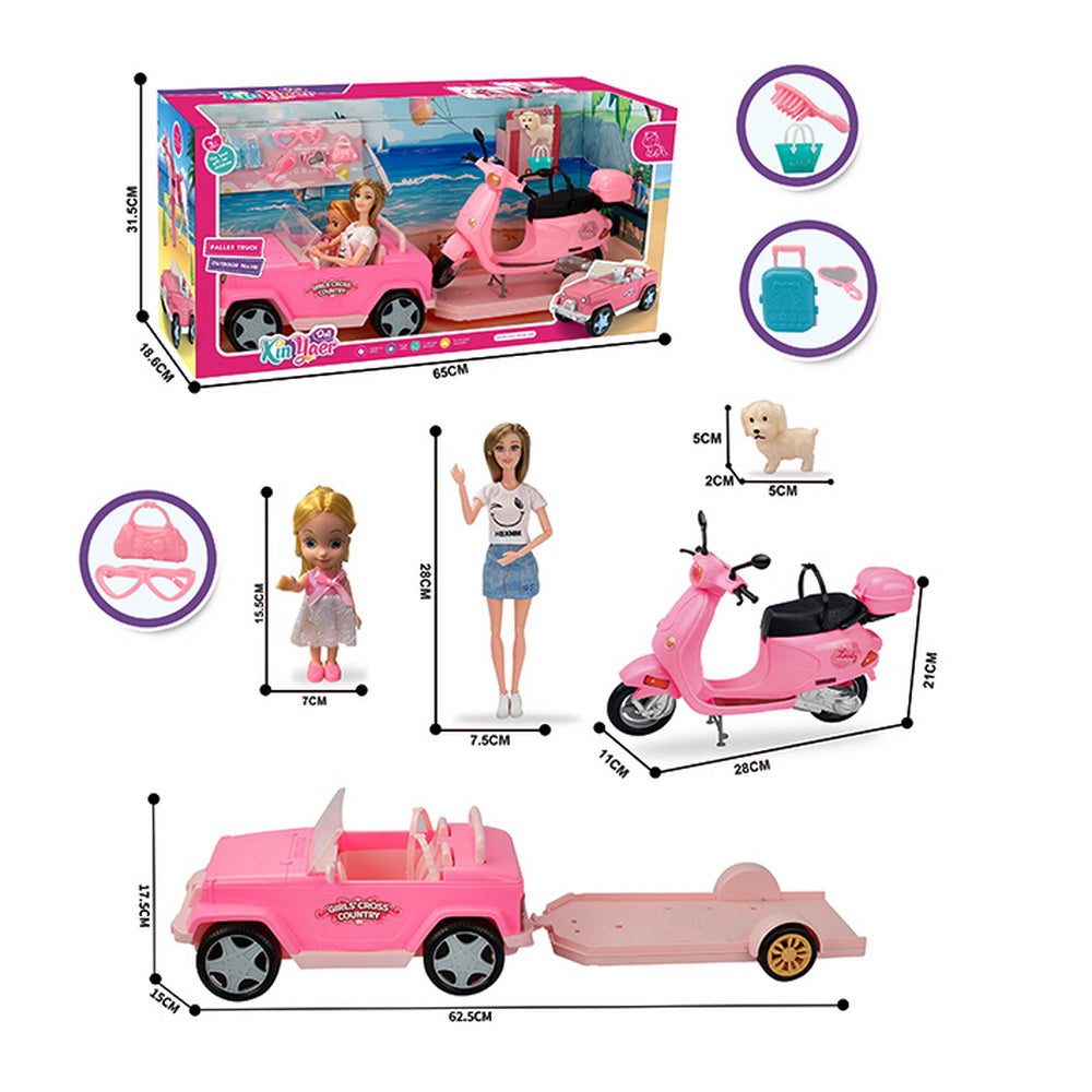 Vive grandes aventuras con el veh’culo todo terrero tipo Barbie con remolque, motocicleta con cesta que incluye un amigo de mascota para compartir la diversi—n y dos mu–ecas para crear un mundo de diversi—n, medidas del empaque 65x31x18,5 cms.
