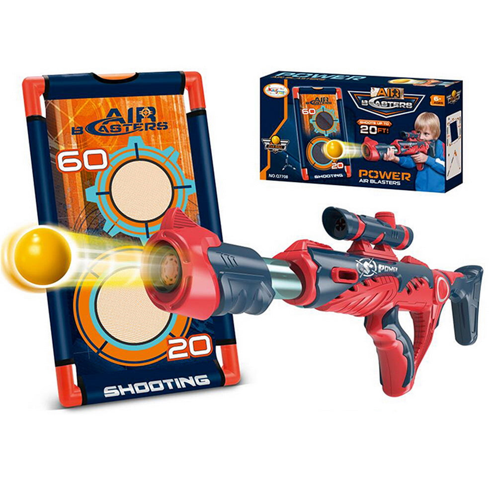 Pistola de Aire Lanza Pelotas de Espuma y Blanco de Tiro de Pie con 2 objetivos, incluye 12 pelotitas de Espuma, viene en caja litografiada, medidas 46,5x6,5x25 cm.
