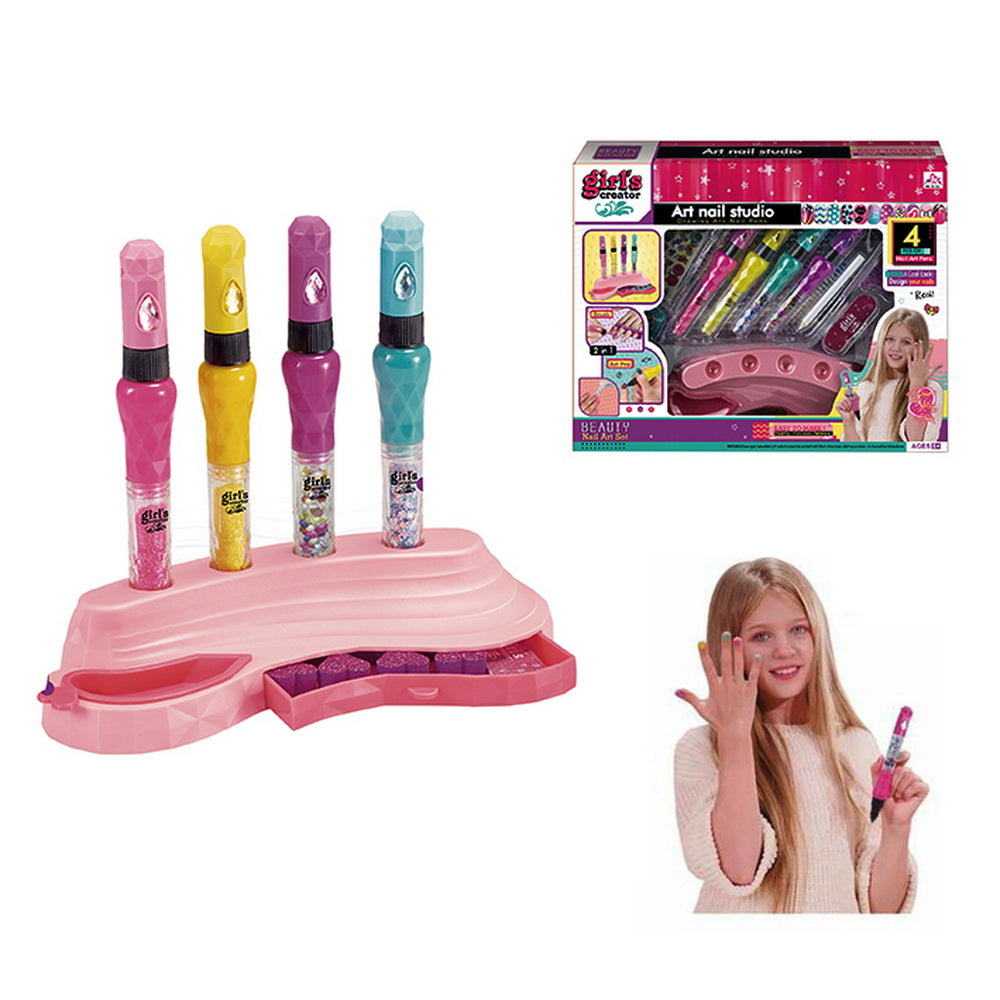 Crea dise–os de u–as con apliques de color con los l‡pices y stickers pinta u–as con 4 colores. crea los mejores dise–os para ti y tus amigas con estos esmaltes de larga duraci—n. Agite y sostenga el bol’grafo en posici—n vertical cuando lo abra. Set Incluye purpurinas de colores para u–as. 4 Rotuladores para u–as. Lima para u–as. Medidas del empaque