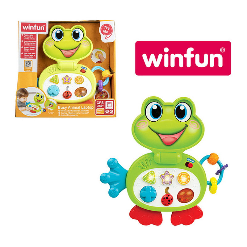 La primera computadora portátil de aprendizaje del bebé con luces intermitentes. 2 modos de juego modo de aprendizaje y música. Introduce 123 y formas. Sonidos divertidos, melodías alegres con anillos deslizantes. Haga clic en el cursor de simulación, el escarabajo deslizante y las cuentas. Utiliza 2 pilas "AAA" incluidas. Medidas 26 x 15 x 5 cm