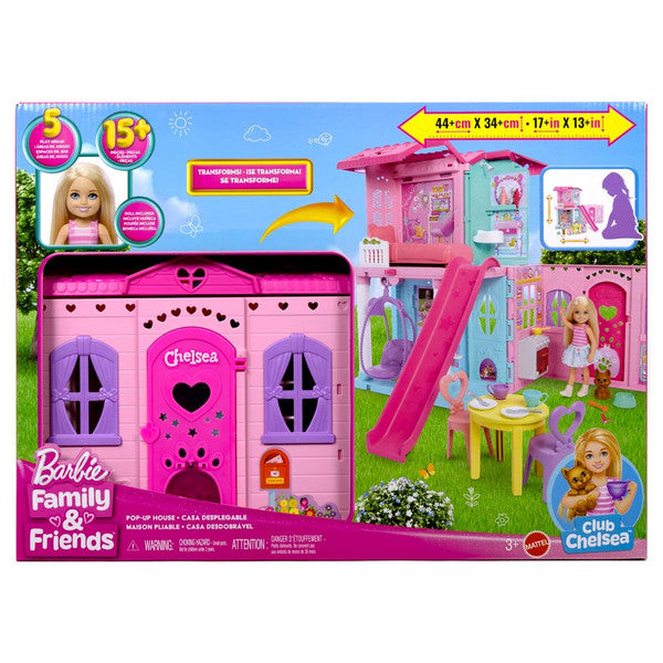 ÁBienvenido a la casa de mu–ecas Pop-Up de Chelsea! Esta peque–a casa se transforma en una gran casa de juegos que revela m‡s de cinco ‡reas de juego. ÁLa mu–eca Chelsea y su cachorro de mascota pueden colgar en la silla de la sala de estar, cocinar en la cocina con un horno que realmente se abre, dormir la siesta en el dormitorio, correr por el tobog‡n e ir al ba–o! Esta casa emergente viene completamente amueblada con accesorios como una cama, una mecedora, una mesa de comedor y sillas, utensilios de cocina, un cepillo de dientes, pasta de dientes, un cuenco para cachorros y mucho m‡s. ÁLos ni–os pueden contar muchas historias divertidas con Chelsea en su dulce hogar!