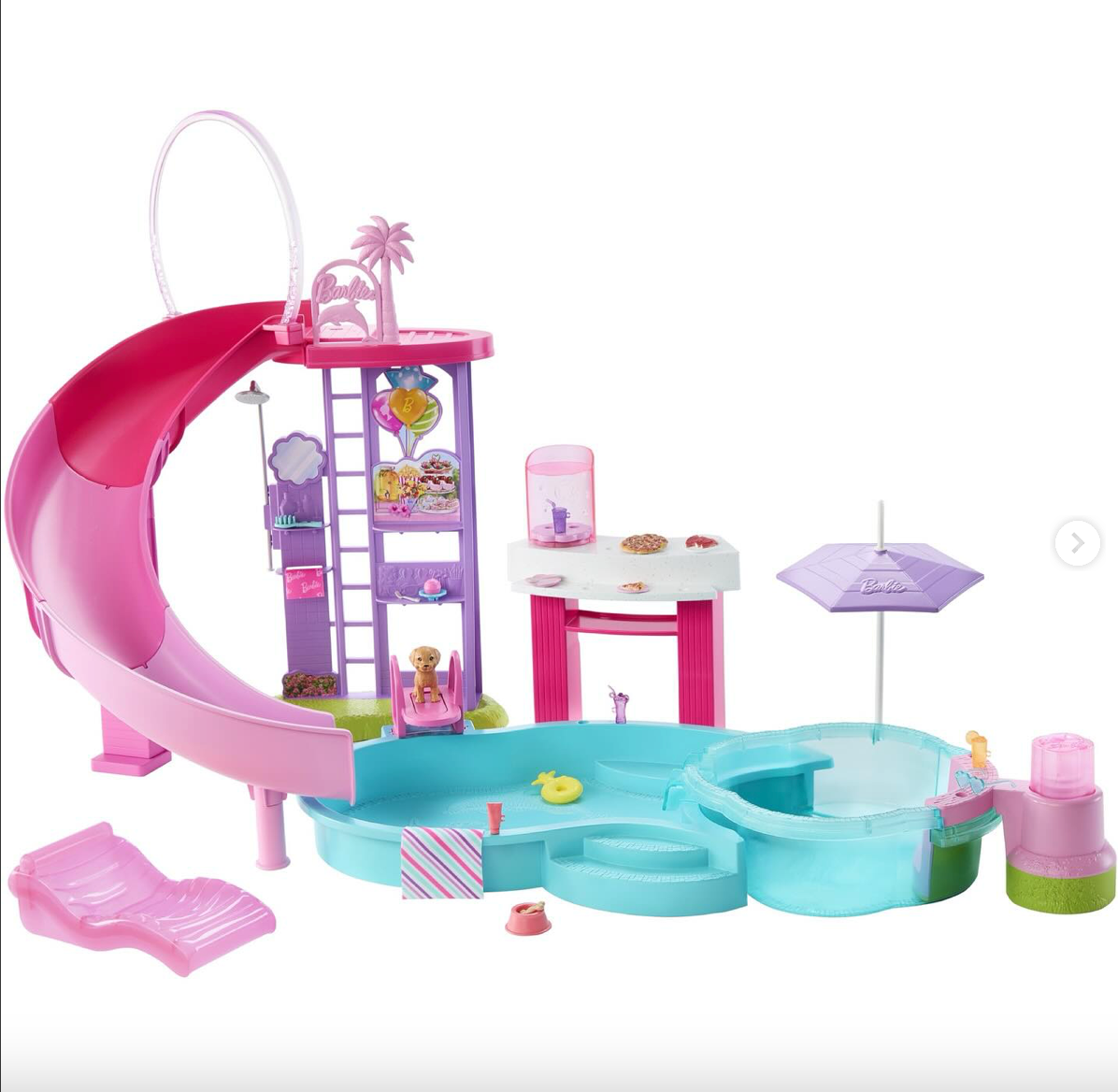 SumŽrgete en un juego sin fin con el set de juego Barbie Dream Pool, con 6 zonas de juego y m‡s de 20 accesorios para la mejor fiesta en la piscina. Incluye piscina, tobog‡n, jacuzzi, ducha, trampol’n y bar. ÁLanza a Barbie por el tobog‡n y deja que se relaje en una tumbona, luego saca la plataforma giratoria para comer algo! El jacuzzi tiene una incre’ble funci—n de burbujas: presiona la bomba para ver c—mo se forman; el borde de la cascada se desborda en la piscina para un toque realista. Los accesorios incluyen un perrito y muchos accesorios tem‡ticos como tumbonas inflables, toallas, una pelota de playa, bocadillos Áy mucho m‡s! Con tantas zonas de juego y accesorios, el set de juego Barbie Dream Pool inspira un sinf’n de historias junto a la piscina. Las mu–ecas Barbie se venden por separado. Apto para ni–as a partir de 3 a–os.