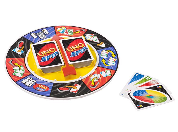 Incluye una ruleta de UNO Spin™, 112 cartas UNO Spin™ y las instrucciones.