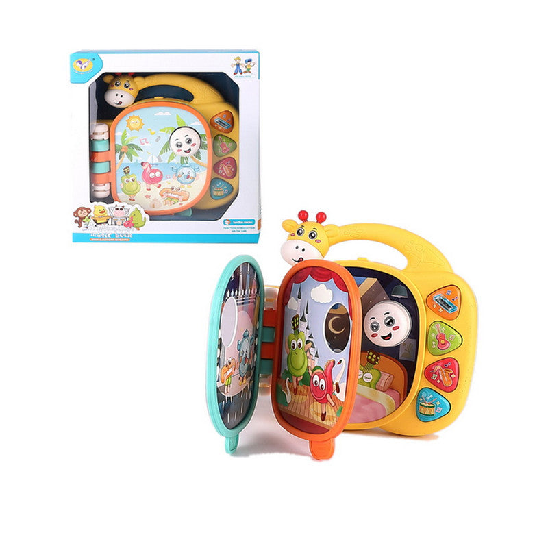 Libro musical interactivo jirafa con las canciones infantiles. Las páginas del libro infantil son muy fáciles de manipular, con dibujos muy coloridos y divertidos. Contiene cuatro teclas que se ilumina para acompañar a los sonidos, elementos divertidos para mover en cada página, utiliza 3 pilas AAA. Medidas del empaque 19,5x6x21 cm.