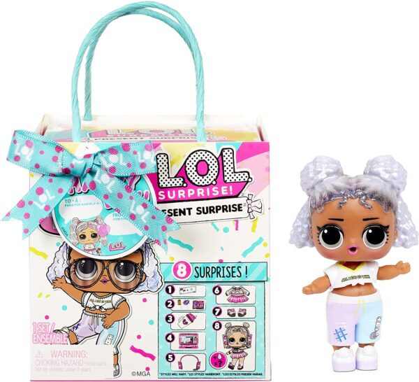 Desempaca el regalo perfecto y 8 sorpresas con LOL Surprise Present Surprise, que incluye una adorable muñeca de 3" con detalles brillantes en la ropa y el cabello.