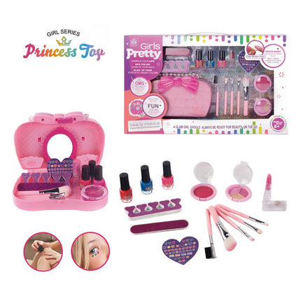 Maleta de Maquillaje Lavables para ni–as est‡n hechos de materiales confiables, con maquillaje real y f‡cil de lavar para proteger la piel suave de las ni–as peque–as, y se pueden usar con confianza. Incluye 5 Brochas de Maquillaje 2 esmaltes de u–as, 2 L‡piz Labial, 1 Lima de U–as, 1 Lindas Pegatinas, 1 Brillo de Labios, 1 Paleta de Sombras Para Ojos. 1 Separadora de Dedos y una linda carterita para guardar y transportar. Medidas del empaque 46,5x7x28 cm.