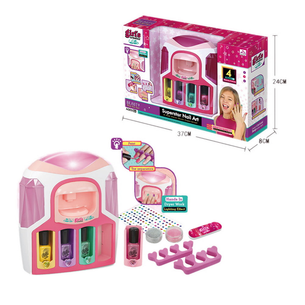 Consigue un estilo profesional en casa con el Sal—n de manicura œnico Go Glam; set que te permite crear dise–os en cualquier tama–o de u–a. ÁAdem‡s de decorar las u–as de las manos tambiŽn puedes decorar las de los pies. Personaliza tus u–as para expresar tu estilo con iconos y colores distintos. utiliza 3 pilas AA. Medidas del empaque 37x24x8 cm.