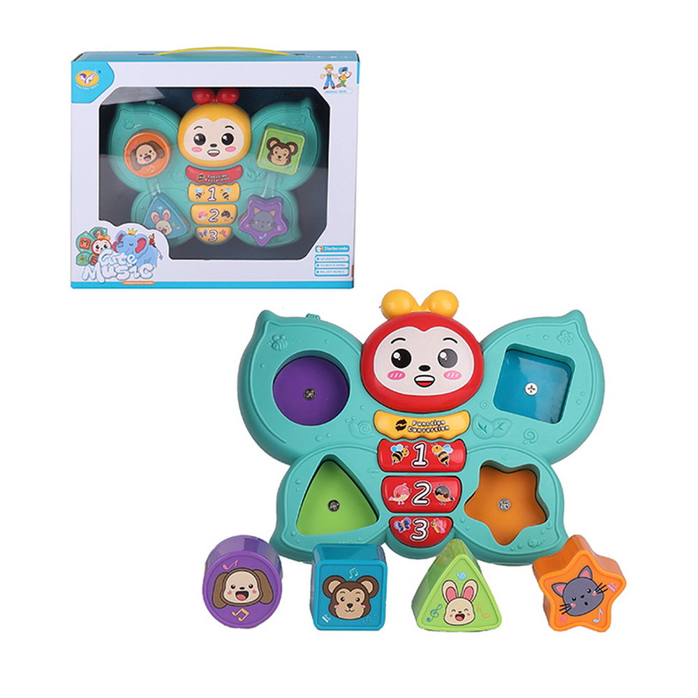 Juguete de mariposa con sonido, encaje de figuras geométricas para bebés y niñas. Proporciona infinitas horas de diversión y entretenimiento. Ayuda a mejorar las habilidades motoras y la coordinación ojo-mano. Botón encendido, apagado. Con toques suaves encienden la Música y sonidos divertidos. Utiliza 3 pilas AAA. Medidas del empaque 25.5x5.5x21 cm.