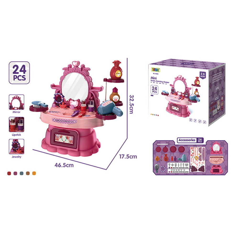 Mini tocador de belleza para niñas, para ayudarlos a desarrollar la imaginación y mejorar los movimientos motrices, el aprendizaje temprano y las habilidades cognitivas y sociales de una niña. Incluye 24 accesorios. Lleva tu maleta a donde quiera que vallas y podrás instalar tu set de maquillaje. Medidas del producto 35x17,5x35 cm