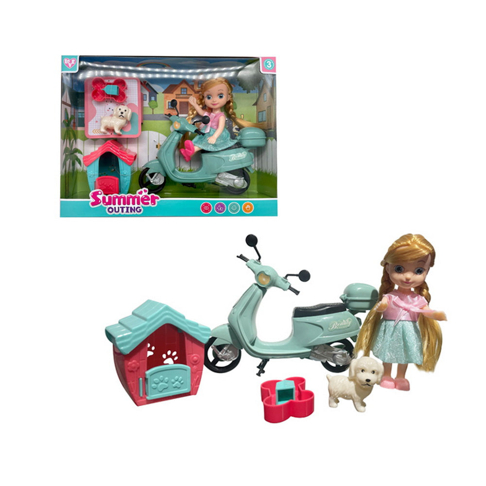 Mu–equita con motoneta de colores llamativos, incluye mascota, casa y accesorio, en caja litografiada con ventana, medidas del empaque 30x22,5x7,5 cm.