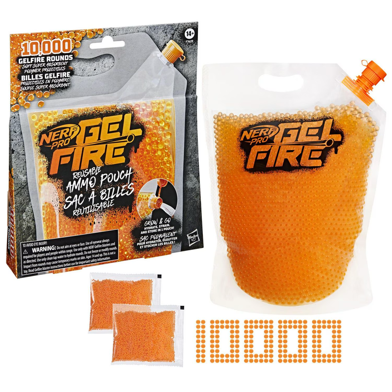 La bolsa de munición reutilizable Nerf Pro Gelfire incluye una bolsa con capacidad de 5.000 rondas para cultivar y almacenar rondas para recargas rápidas y fáciles en la batalla. Incluye 10.000 rondas deshidratadas de Nerf Gelfire. Agregue agua a la bolsa para hidratar las rondas durante 3 a 4 horas, luego viértalas en los blásters Nerf Pro Gelfire. La tapa de la bolsa tiene un colador incorporado para una preparación de ronda simple y todo en uno. Diseñada para la portabilidad, la bolsa de munición de diseño elegante tiene un asa incorporada y se pliega para un almacenamiento compacto. Cuando se disparan desde los blasters Nerf Pro Gelfire, los proyectiles de polímero súper absorbentes suaves hidratados se disparan a alta velocidad y explotan al impacto. ¡No hay necesidad de recoger rondas! ¡Rompe los límites de los blasters de batalla Nerf Pro Gelfire que ofrecen un rendimiento superior para encender tu ventaja competitiva! Se recomienda el uso al aire libre. Cada uno de los Blasters se vende por separado, sujeto a disponibilidad. Para mayores de 14 años.