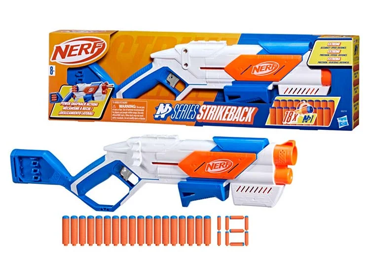 ¡La marca Nerf lleva tu juego al siguiente nivel con los lanzadores y dardos de alto rendimiento N1 de Nerf N Series! Ya posees la habilidad de un jugador de Nerf, y ahora tienes el lanzador y los dardos para dominar en los juegos bajo techo y al aire libre. De los creadores del dardo de espuma, la marca Nerf revela la nueva fase en la evolución de los dardos con los dardos N1 de Nerf N Series, ¡ofreciendo EXTREMA PRECISIÓN, VELOCIDAD y DISTANCIA! ¡El lanzador Nerf N Series Strikeback cuenta con la poderosa acción de deslizamiento lateral! ¡Podrás ver y sentir esta increíble función cuando aprietes el gatillo! El lanzador cuenta con un clip integrado con capacidad para 6 dardos. Tiene un portadardos integrado con capacidad para 12 dardos e incluye 18 dardos Nerf N1 para que tengas más dardos a la mano a la hora de recargar. ¡Es un excelente lanzador para tus juegos al aire libre! Edad recomendada: A partir de 8 años. Los lanzadores Nerf N Series solo son compatibles con los dardos N1 de la línea Nerf N Series. Se recomienda el uso de gafas (no incluidas).