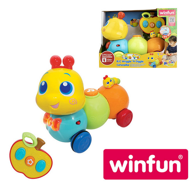 Oruga de control remoto infrarrojo. Lindo control en forma de manzana. Sonidos divertidos y melodías alegres. Movimiento de avance y retroceso por control remoto. Pajarita intermitente y pequeña oruga deslizante. Utiliza 3 pilas "AA". La oruga y el control 2 pilas "AAA". Medidas 11,8 x 19,5 x 26 cm