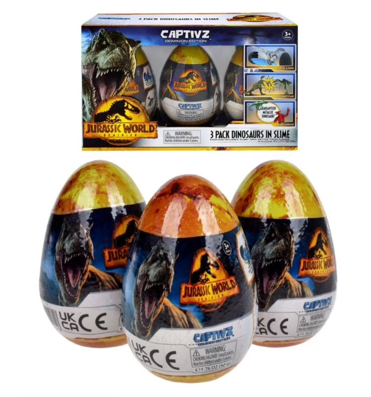 PACK 3 HUEVOS CON DINOSAURIOS, SLIME, MONEDAS Y GUIA JURASSIC WORLD DOMINION