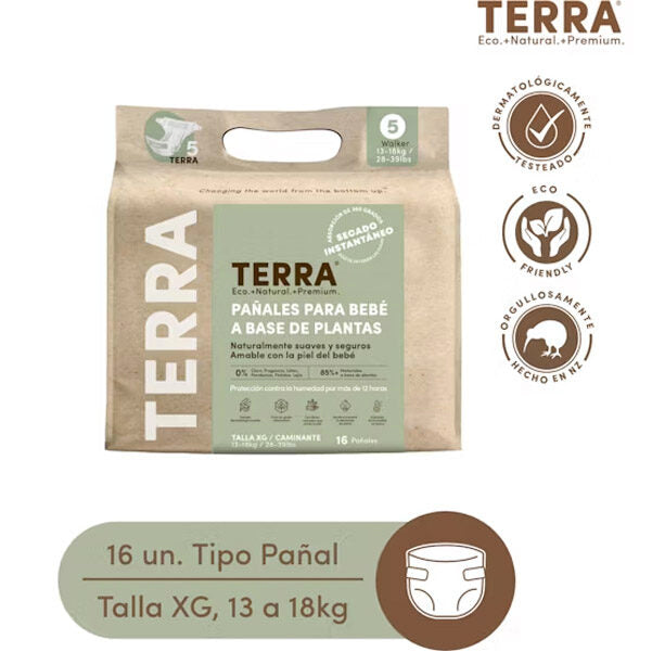 Desde que tu pequeño llega al mundo, los pañales Terra, fabricados en un 85% a base de plantas, están ahí para proteger su suave y delicada piel desde el primer momento.