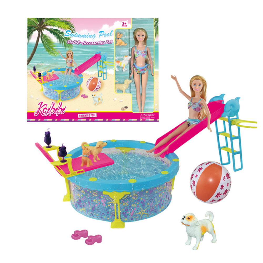 Mu–eca Kaibibi y juego de piscina con tobog‡n y accesorios la piscina es f‡cil de llenar y vaciar, adem‡s cuenta con espacio suficiente para que coloques 2 o 3 mu–ecas, disfruten de una tarde muy refrescante. La piscina tiene integrado un divertido tobog‡n para deslizarse y un ‡rea integrada para sentarte y descansar. Este set incluye piscina con tobog‡n y una mu–eca con traje de ba–o con estampado tropical y colorido y 3 mascotas. Medidas del empaque 42x6.5x33 cm.