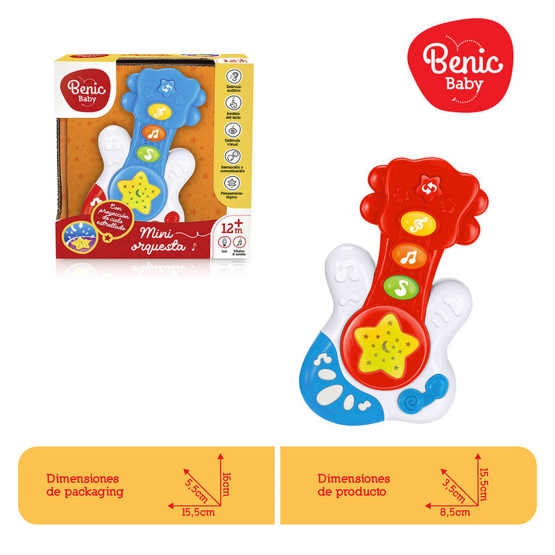 Proyector musical en forma de guitarra, con luces y sonidos. Disponible en azul y rojo. Leer más...