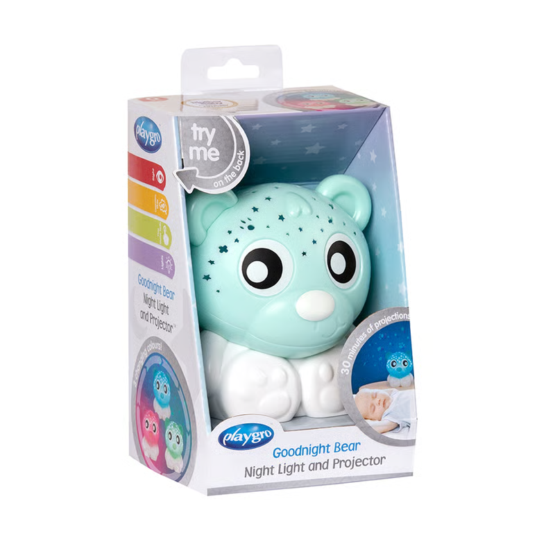 Como nos gusta cuidar lo que más amas, cuidamos los sueños de tu bebé con este adorable Proyector Osito Blue de Playgro, el cual proyecta un hermoso cielo nocturno en la habitación de tu pequeño o puedes utilizar este proyector como una reconfortante luz nocturna. Cuenta con 30 minutos de tiempo de proyección, su diseño de osito tierno lo hace muy entretenido y adorable para los pequeños, además es inalámbrico y posee un tamaño compacto, brindándote la posibilidad de llevarlo a donde quiera que vayas. Este juguete es ideal para ayudar a tu bebé en el desarrollo de la coordinación ocular y visual, también le crea hábitos de sueño y noches más tranquilas y reconfortantes. Requiere de 3 pilas AAA, no incluidas.