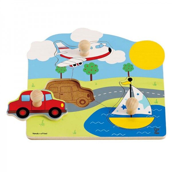 Encaje con tres piezas de medios de transportes, cada una con un tarugo para facilitar el agarre.