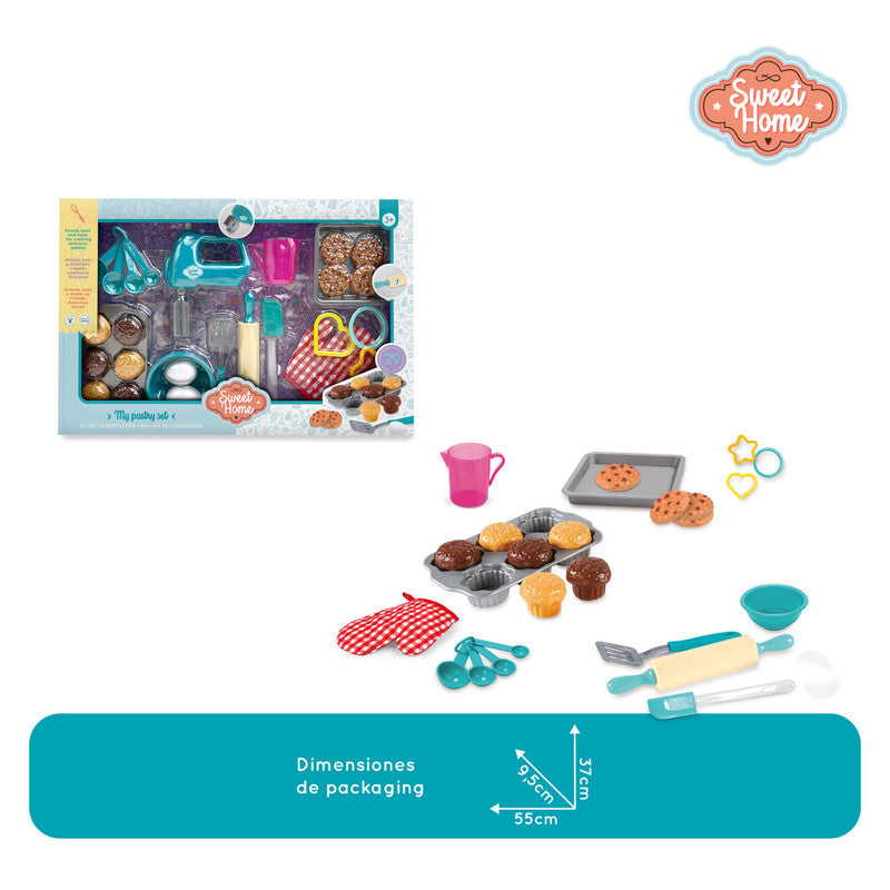 Set de pastelería de juguete con batidora mecánica, uslero giratorio, espátula, guante y 25 accesorios.