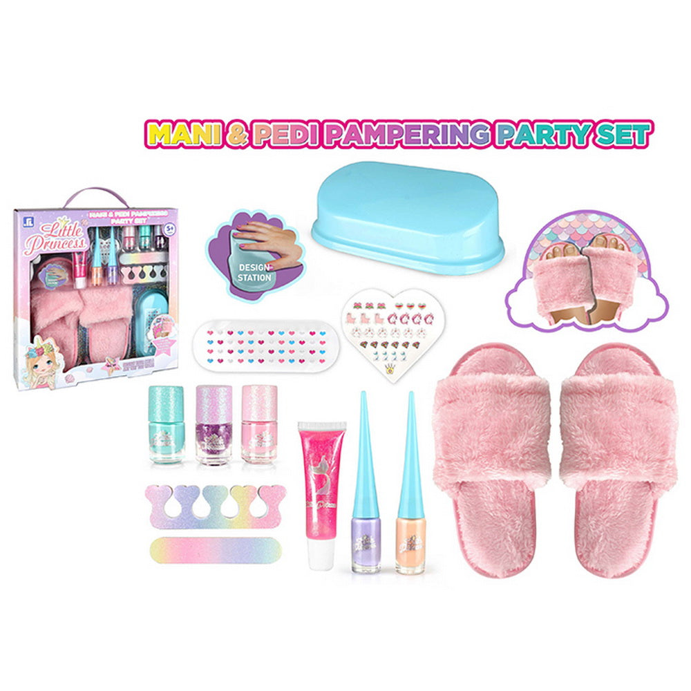 Set de pedicura para las princesas de la casa, incluye barra de labios, brillo de labios con brillos, esmalte de u–as separador de dedos. Lima y unas lindas pantuflas. Vine en caja litografiada de 30.2x 5.3x29 cm.