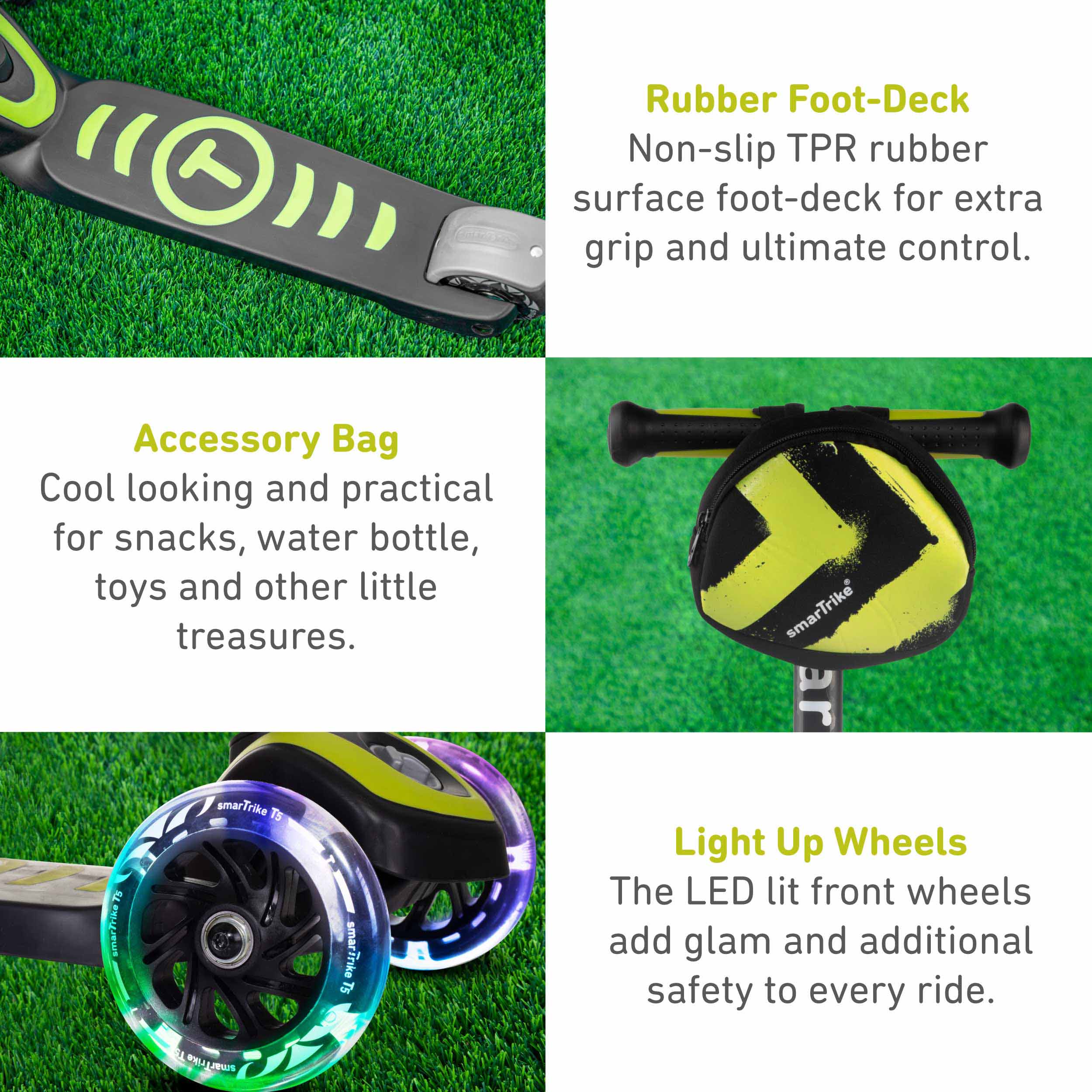 Ofrece a tu hijo un paseo emocionante y a ti uno seguro. El T5 cuenta con 3 ruedas para mayor estabilidad y ruedas LED de alta calidad, lo que lo hace perfecto para patinar en interiores y exteriores.