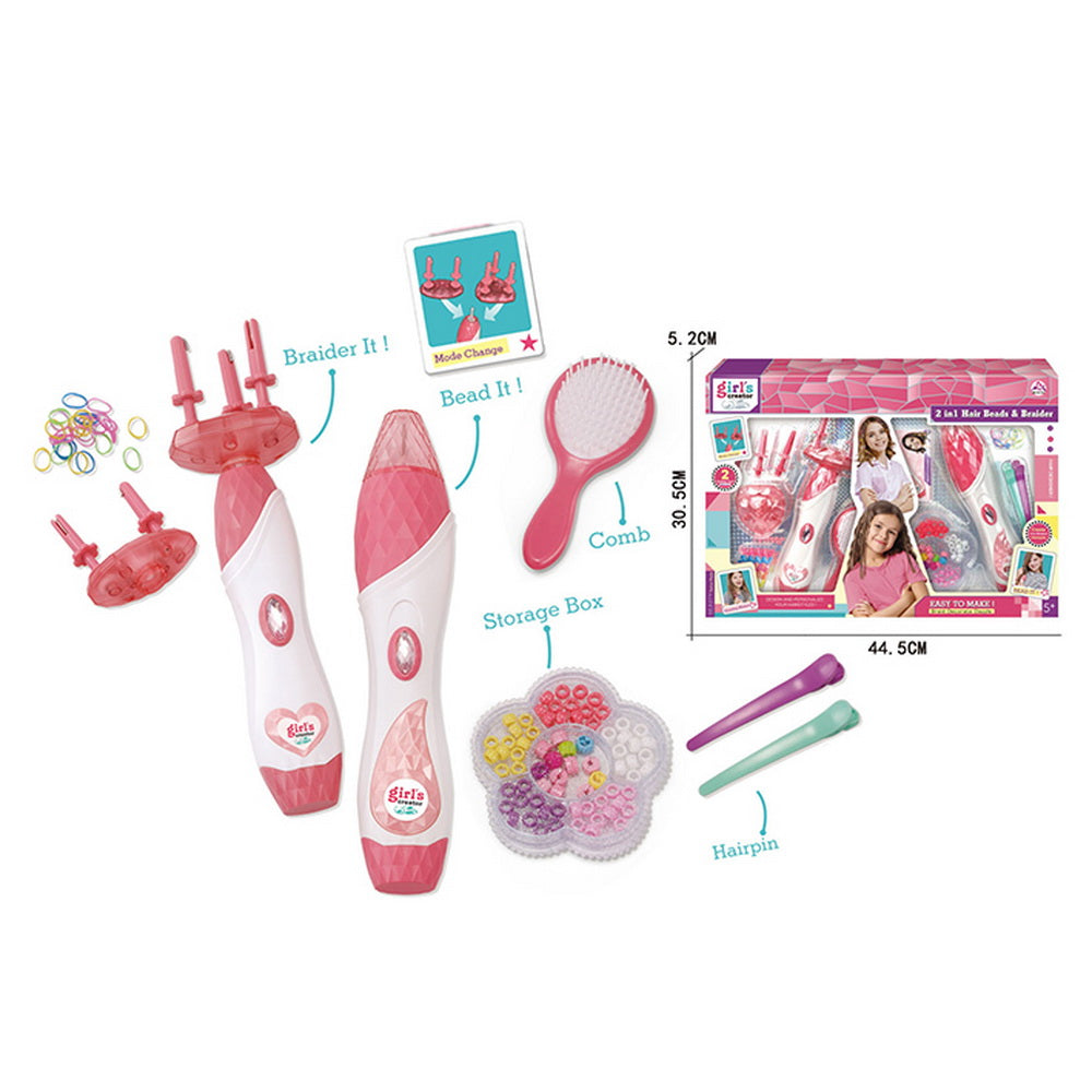 Set de dos maquinas, un trenzador con dos accesorios y una para colocar mostacillas en tu cabello, utilizan 2 pilas AA cada una, incluye cepillo, pinzas para el pelo y una caja con cuencas. En caja litografiad de 30 x 2,5 x 44.5 cm